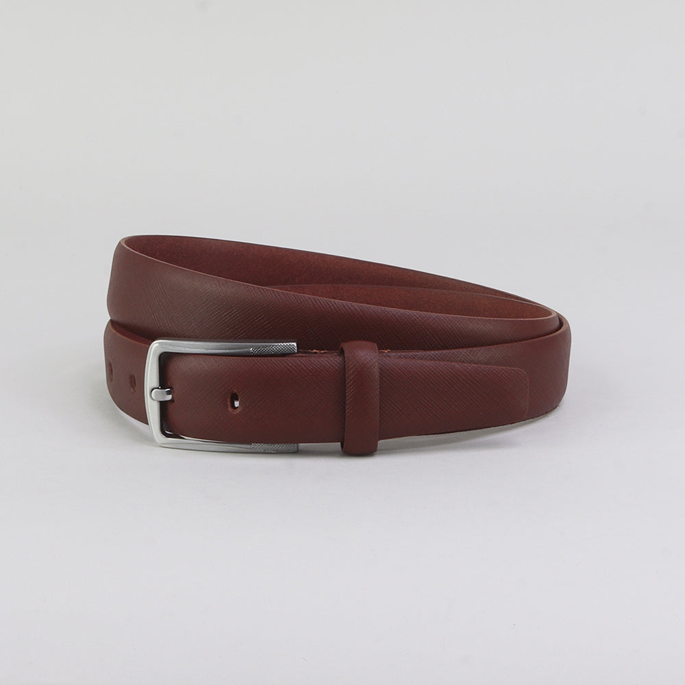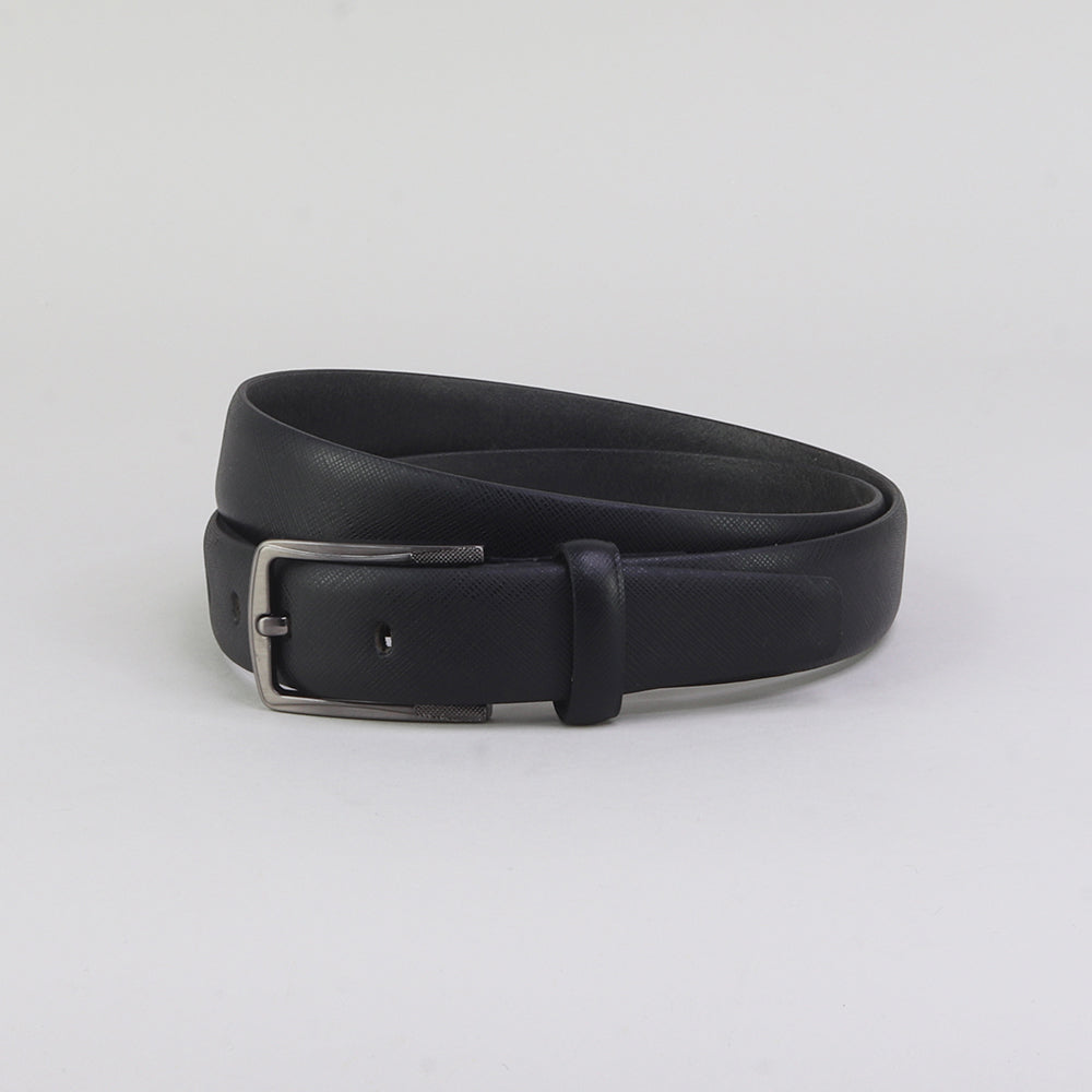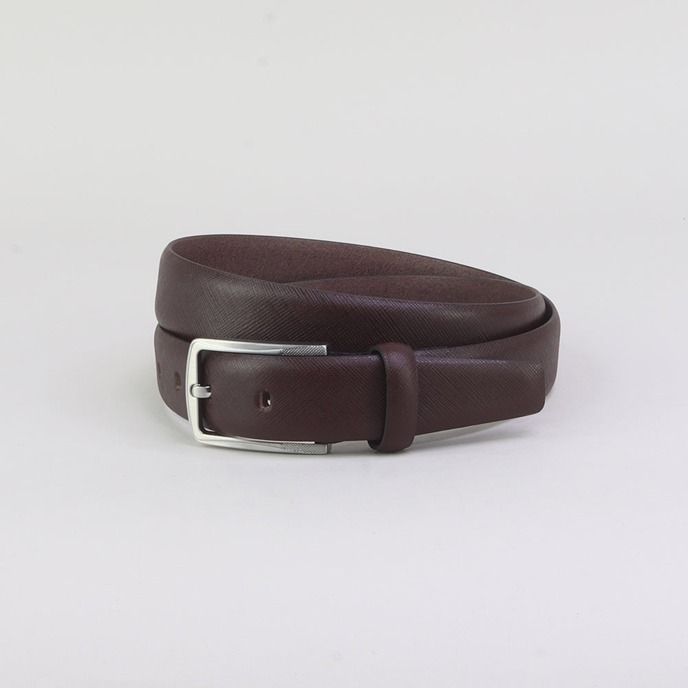 Our 29mm formal feather edge full grain leather suit belt features a saffiano print and an accentuated Italian tip. It's silver-finished buckle also features a subtle matching texture, making it perfect for suiting.