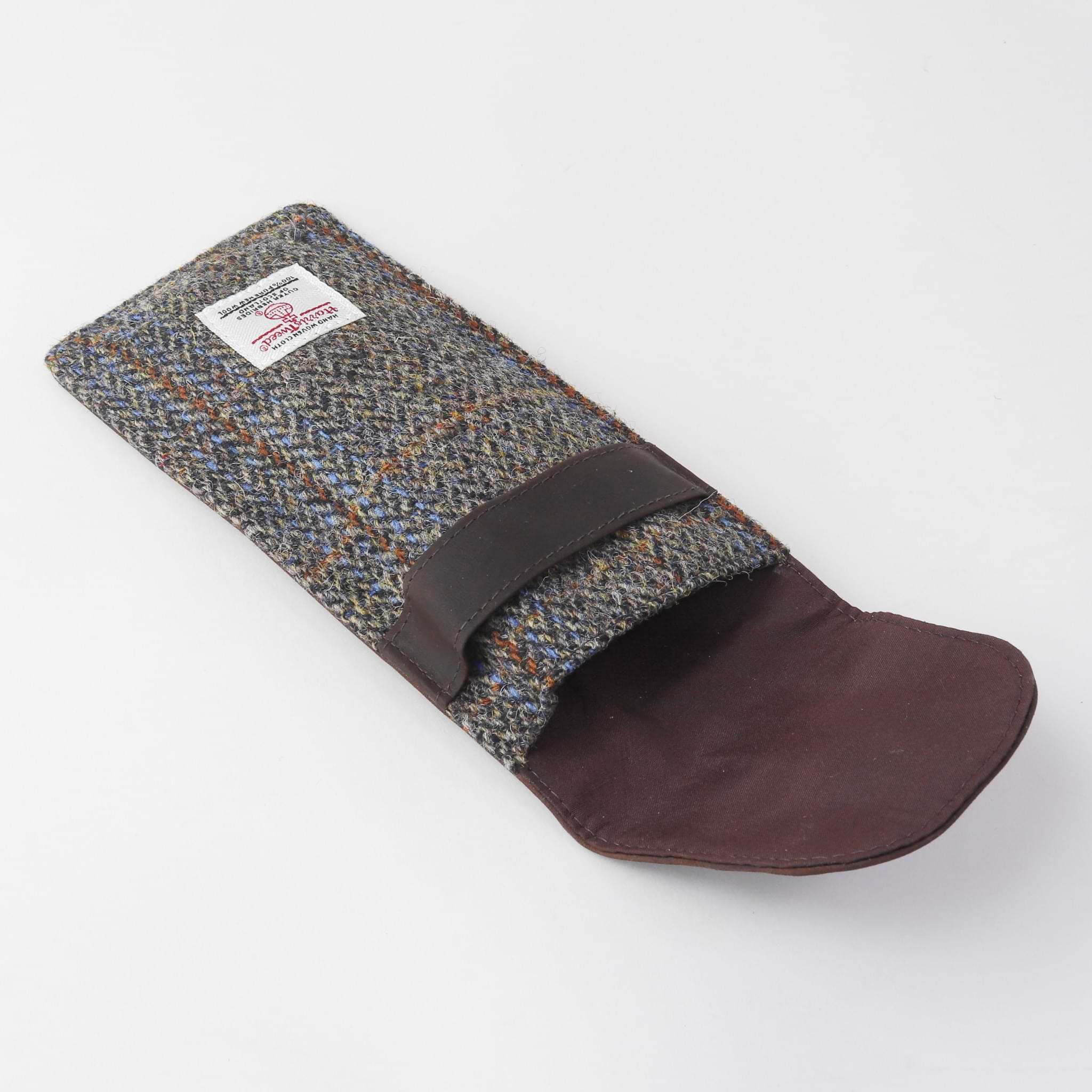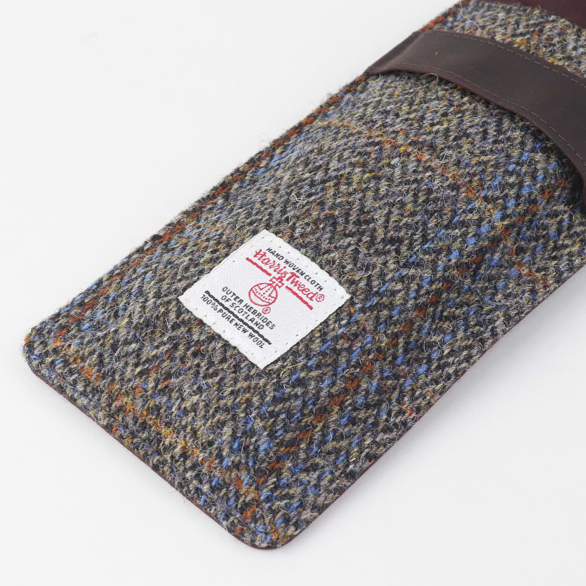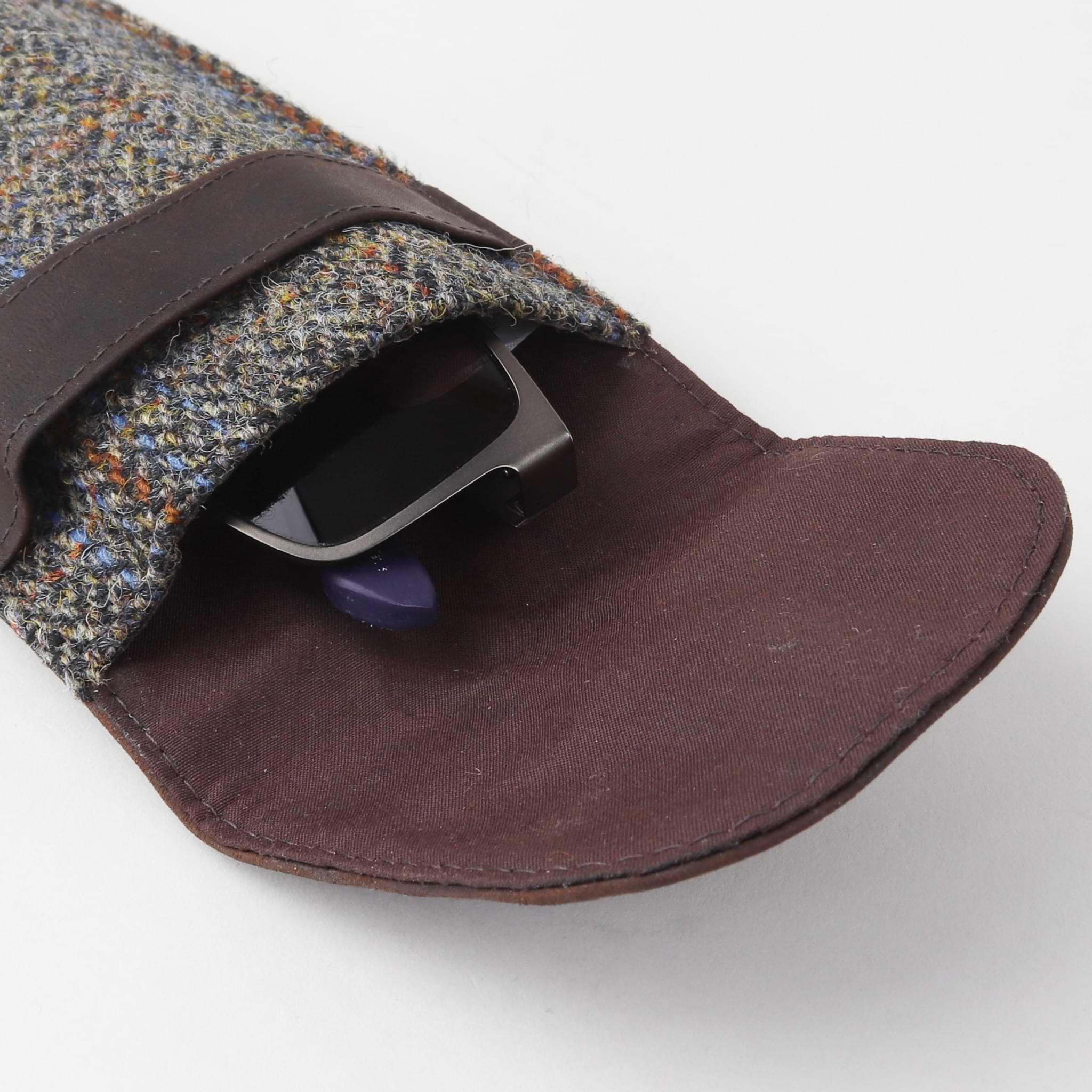 Made from luxurious leather and Harris Tweed, the world renowned fabric crafted by local artisans on the Isle of Harris, our elegant fold over glasses case exudes classic English heritage. With a blend of earthy tans and browns and a summary pop of blue, the dark reddish-brown leather creates a sophisticated statement piece, perfect as a gift or personal indulgence. This timeless accessory is sure to add a touch of refined elegance to your wardrobe. The combination of pristine Harris Tweed and luxuriously soft leather will have you turning heads with every glance. Each fold over glasses case is a unique work of art, a perfect amalgamation of traditional craftsmanship and modern styling.