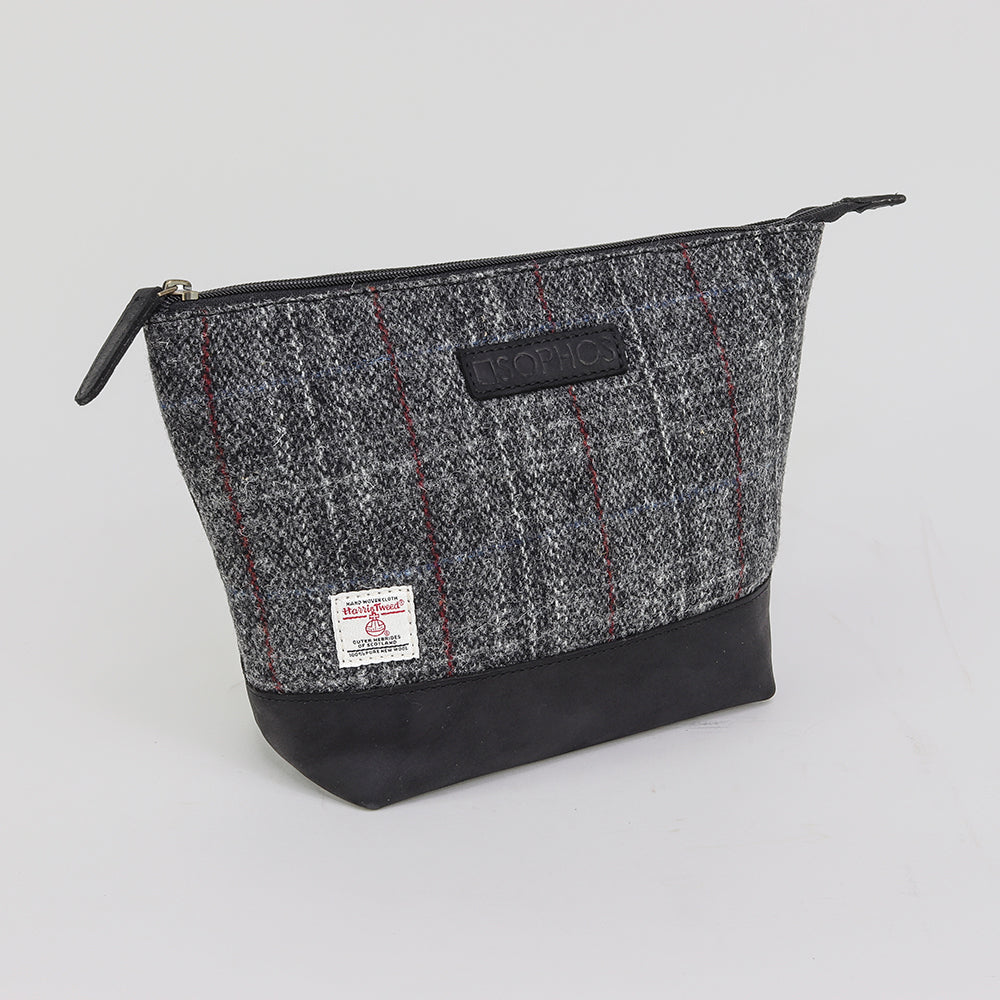 Our fashionable T-bar style washbag blends reliable leather with pure virgin Harris Tweed wool, revered worldwide for its signature crofter-crafted quality. This stylish grey tweed evokes classic English heritage with a modern edge, the striking check pattern gracefully complemented by black leather edging. A luxurious present for someone special or a delightful indulgence for yourself. A timeless look and trusted durability: the perfect combination for any discerning traveler. Its unique design embodies elegance and practicality, the perfect blend of luxury and sophistication. Enjoy a touch of tradition and effortless style for your next journey.